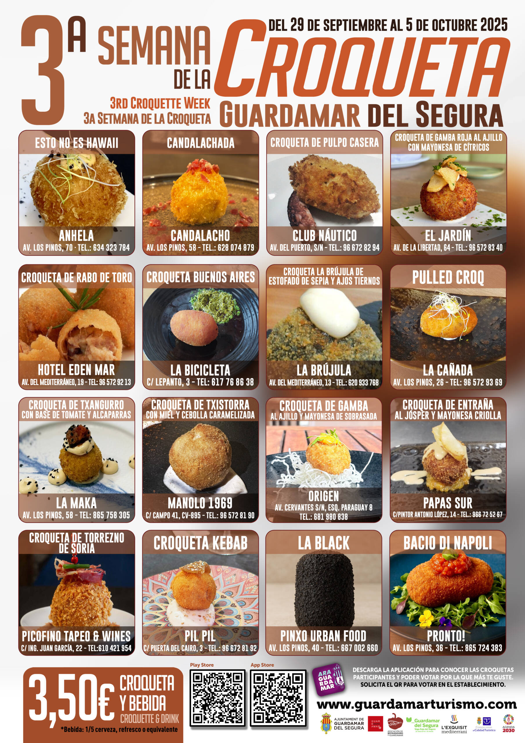 Guardamar del Segura becomes once again the capital of Spain’s most iconic tapa. From 29 September to 5 October 2025, the city celebrates the 3rd Croquette Week in Guardamar del Segura – an event that combines flavour, creativity and tourism. For one week, more than 16 local venues will offer their best croquette creations, from the most traditional to the most innovative ones.